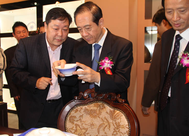全國人大常委會(huì )副委員長(cháng)韓啟德在我公司展館參觀(guān),對我公司在全國青花玲瓏及青花日用陶瓷器形與裝飾設計大賽金獎作品《憶漢》非常感興趣