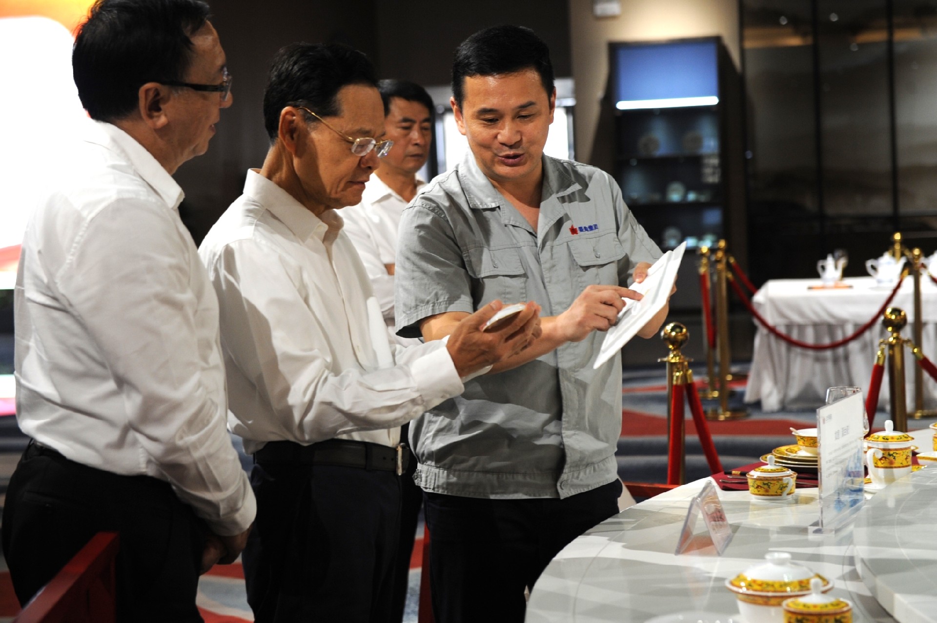 在國瓷館展廳,鄧景揚向陳武介紹了紅葉陶瓷產(chǎn)品特色和先進(jìn)制瓷工藝,重點(diǎn)講述了一系列“國瓷”“國禮”故事。陳武對精美的產(chǎn)品給予高度評價(jià)。