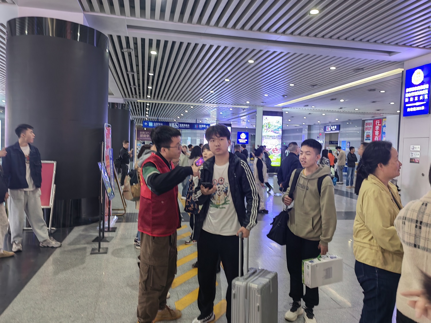 在各服務(wù)站點(diǎn),志愿者們一會(huì )兒化身導游,一會(huì )兒化身美食家,一會(huì )兒化身行李俠……為旅客提供周到的服務(wù),旅客們紛紛點(diǎn)贊志愿者們熱心、舒心、暖心!
